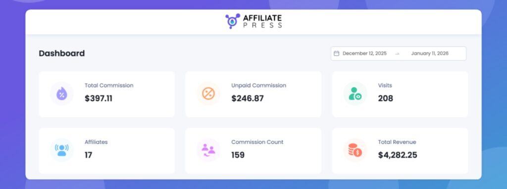 AffiliatePress offers a free version of its WordPress affiliate marketing plugin. At its core, the free version lets you register and manage an unlimited number of affiliates on your site. You can set up commission tracking and record referrals, manage payouts manually, and run your affiliate program entirely from WordPress. The plugin also includes a simple setup wizard to help you get started, as well as user panels for both administrators and affiliates so people in your program can see their stats and links.