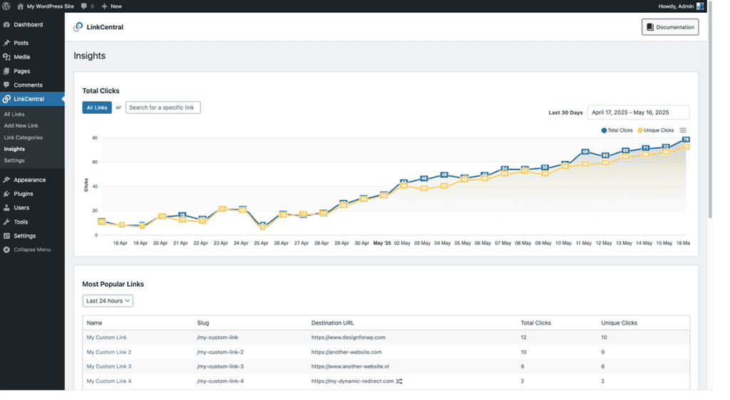 If you want a self-hosted affiliate link shortener inside WordPress, LinkCentral is one of the most polished free options available. At its core, it lets you create clean, branded short URLs instead of long affiliate links. This makes URLs easier to remember and can help improve click-through rates. It includes built-in analytics so you can see how often each link is clicked directly from your WordPress dashboard.