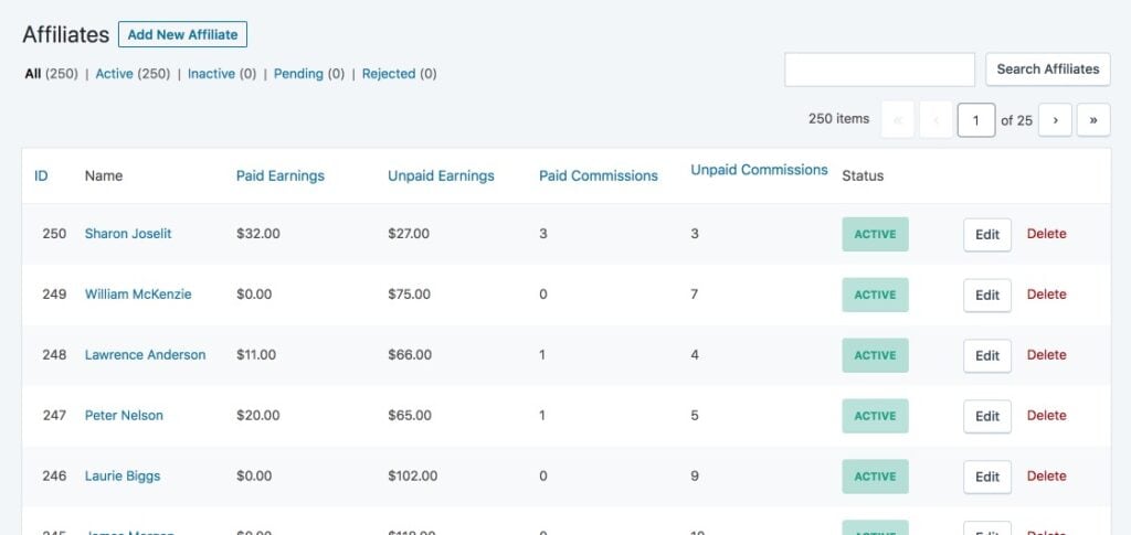 Right after installing the free version, you gain access to an unlimited affiliate management system. You can let partners register themselves or add them manually, and the plugin tracks visits and referrals from your affiliates’ unique links.